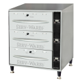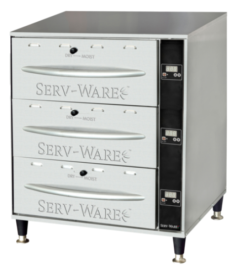Serv-Ware - Electric Cooking - 3 Drawer Warmer - Dimensions: 27.75" W x 21" D x 33.63" H - Temperature Range: 80°F – 220°F - Amps: 11.25 - Voltage: 120 - Hz: 60 - Phase: 1 - Watts: 1350 - Materials: Heavy duty stainless steel construction with 1" thick fiberglass for maximum insulation - Warranty: 1 Year