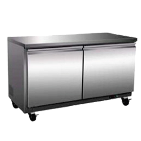 Refrigerator, undercounter, two-section, 61"W x 29-9/10"D x 35-1/2"H, 15.5 cu. ft. capacity, (2) self-closing solid doors, full length handles, (1) epoxy-coated wire shelf per door, electronic thermostat, LED digital display, auto defrosting & evaporation, stainless steel front & sides, ABS interior with stainless steel floor, (4) casters (2 braked), rear mounted self-contained refrigeration, cULus Classified, UL EPH Classified, CE