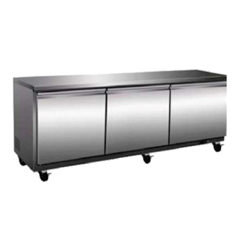 Refrigerator, undercounter, three-section, 71-1/2"W x 29-9/10"D x 35-1/2"H, 18 cu. ft. capacity, (3) self-closing solid doors, full length handles, (1) epoxy-coated wire shelf per door, electronic thermostat, LED digital display, auto defrosting & evaporation, stainless steel front & sides, ABS interior with stainless steel floor, casters (2 braked), self-contained refrigeration, cULus Classified, UL EPH Classified, CE