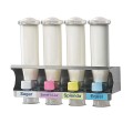 SWTS SWEETSTATION™ DISPENSER, QUAD 24 OZ., wall-mounted rack, with (4) 24 oz. capacity InSweeten™ dispensers, allows for single-handed serving of preset sweetener portions, equivalent to common portion packs, includes (1) dispenser with 2.8 gram white trigger and (1 each of) yellow, pink and blue triggers with 1 gram servings, color-coded flavor decals supplied for Sugar, Sweet'n Low®, Splenda® & Equal®, BPA Free, NSF