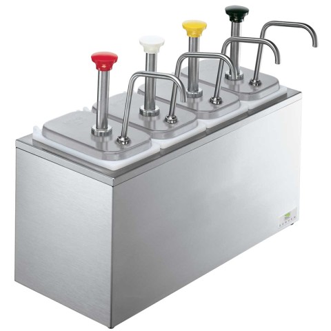 SB-4 COLD STATION, (4) JARS & PUMPS, insulated base, comes complete with (4) 3-1/2 qt. fountain jars and (4) pumps, for serving thick condiments or thicker craft sauces, ambient or chilled application, dispenses 1-1/4 oz., with collars provided to reduce portions in 1/8 oz. increments, accepts (4) Ice packs (94141) (sold separately), white plastic jars, stainless steel pumps and base, NSF