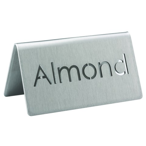 Beverage ID Tent, "Almond", 1-1/2"H x 3"W, laser-cut, dishwasher safe (hand washing is recommended), 18/8 stainless steel, brushed finish, Made in USA (Priced per each, packed 6 each per case)
