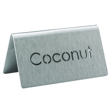 Beverage ID Tent, "Coconut", 1-1/2"H x 3"W, laser-cut, dishwasher safe (hand washing is recommended), 18/8 stainless steel, brushed finish, Made in USA (Priced per each, packed 6 each per case)