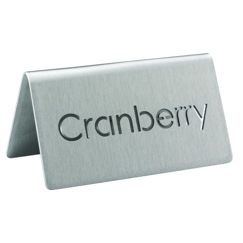Beverage ID Tent, "Cranberry", 1-1/2"H x 3"W, laser-cut, dishwasher safe (hand washing is recommended), 18/8 stainless steel, brushed finish, Made in USA (Priced per each, packed 6 each per case)