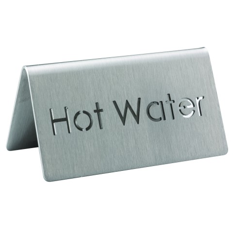 Beverage ID Tent, "Hot Water", 1-1/2"H x 3"W, laser-cut, dishwasher safe (hand washing is recommended), 18/8 stainless steel, brushed finish, Made in USA (Priced per each, packed 6 each per case)