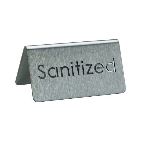 Beverage ID Tent, "Sanitized", 1-1/2"H x 3"W, laser-cut, dishwasher safe (hand washing is recommended), 18/8 stainless steel, brushed finish, Made in USA (Priced per each, packed 6 each per case)