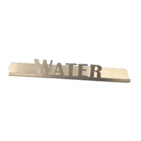 Beverage ID Sign, "Water", 1"H x 6-1/2"W, laser-cut, dishwasher safe (hand washing is recommended), 18/8 stainless steel, brushed finish, Made in USA (Priced per each, packed 6 each per case)