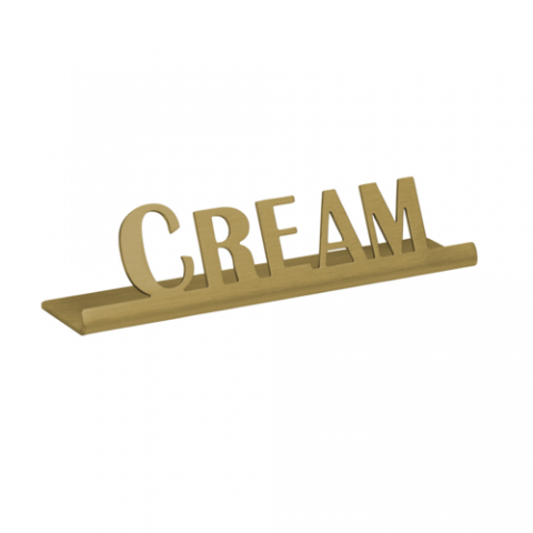 Table Sign, "Cream", 1"H x 4"W, laser-cut, dishwasher safe (hand washing is recommended), stainless steel, vintage gold, Made in USA
