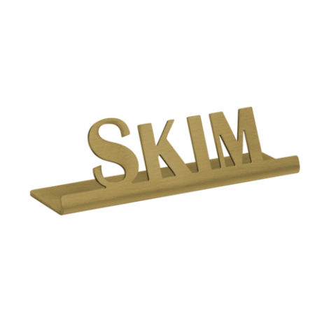 Table Sign, "Skim", 1"H x 3-1/2"W, laser-cut, dishwasher safe (hand washing is recommended), stainless steel, vintage gold, Made in USA