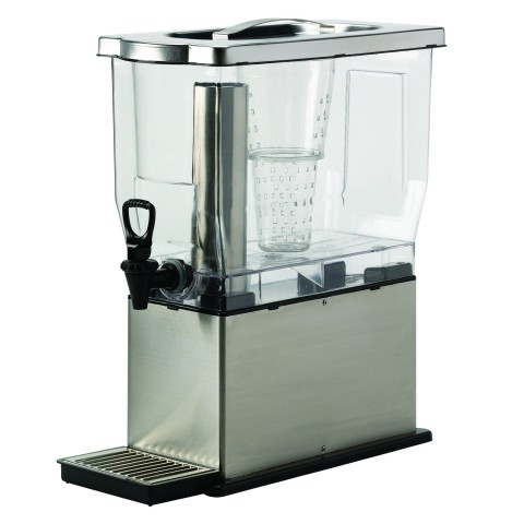 Beverage Dispenser, 3 gallon (384 oz.), 8-1/4" x 17-1/2" x 20", rectangular, slim design, includes: freezable stainless steel ice tube, removable infuser tube, spigot, drip tray and flavor indicator labels, dishwasher safe, clear BPA free triton container, stainless steel lid & base, brushed finish, NSF (Priced per each, packed 6 each per case)