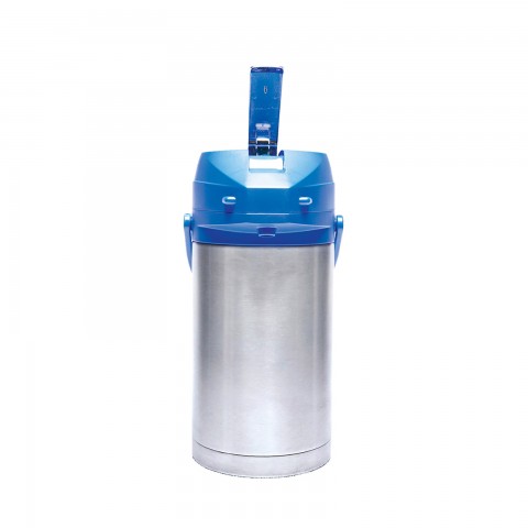 Airpot, 3 liter (101.4 oz.) 6-3/4" x 8-3/4" x 13-1/4", retention: 4-6 hours, vacuum insulated, lever style, stainless steel liner, blue lid, hand wash (do not submerge), 18/8 stainless steel, brushed, NSF (Priced per each, packed 6 each per case)