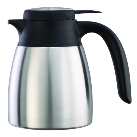 Beverage Carafe, 0.6 liter (20 oz.), 4-3/4" x 6-3/4" x 6", black plastic push-button lid, retention: 4-6 hours, flow control with adjustable rubber lid gasket, dishwasher safe, vacuum insulated, brushed stainless steel interior & exterior, Agion® anti-microbial clear coat finish, NSF (Priced per each, packed 6 each per case)