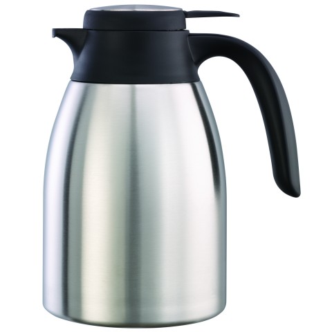 Beverage Carafe, 1.2 liter (40.6 oz.), 4-3/4" x 6-3/4" x 8", black plastic push-button lid, retention: 4-6 hours, flow control with adjustable rubber lid gasket, dishwasher safe, vacuum insulated, brushed stainless steel interior & exterior, Agion® anti-microbial clear coat finish, NSF (Priced per each, packed 6 each per case)
