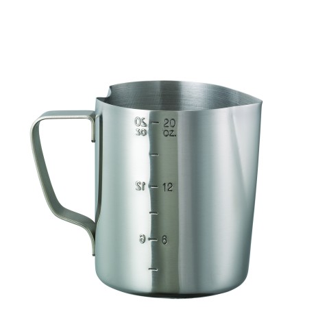 Frothing Pitcher, 0.6 liter (20 oz.), 3-1/2" x 5-1/2" x 4-1/4", with handle, dishwasher safe, graduated markings with 6 oz. increments interior & exterior, thermometer rest (thermometer sold separately), stainless steel, brushed finish (Priced per each, packed 24 each per case)