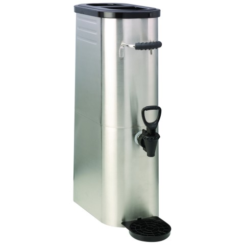 Tea Dispenser, 3-1/2 gallon (448 oz.), 17-1/2" x 6" x 23", single wall, slim design, includes: snap on drip tray, black plastic lid, and gravity fed spigot, flavor indicator labels, hand wash, cold beverages only, ergonomic handles, flip down handle on back, stainless steel, brushed finish, NSF (Priced per each, packed 6 each per case)