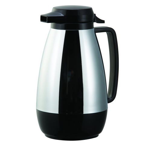 Metallic Luster® Server, 1 liter (33.8 oz.), 4" x 6" x 9-1/4", retention: 2-3 hours, smooth body, welded seams, reinforced handle, dishwasher safe (hand wash recommended), double-wall, foam insulated, push-button lid, non-drip spout, BPA free, metallic silver/black, Made in USA (Priced per each, packed 6 each per case)