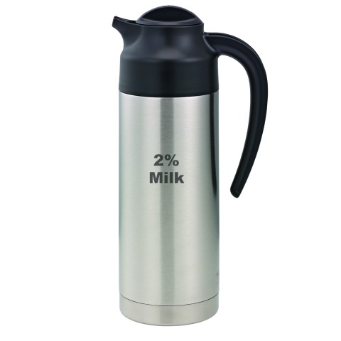 SteelVac™ Vacuum Creamer, 1 liter (33.8 oz.), 3-1/2" x 6" x 11-1/2", "2% Milk" etched on side, retention: 4-6 hours, dishwasher safe, smooth body, double-wall, unbreakable liner, black screw-on lid, stainless steel base, brushed, NSF (Priced per each, packed 6 each per case)