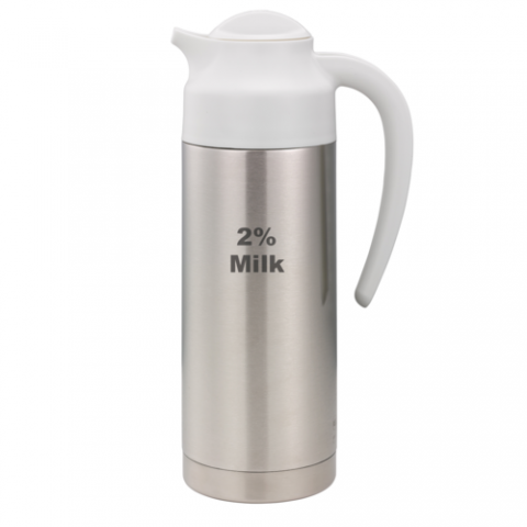 SteelVac™ Vacuum Creamer, 1 liter (33.8 oz.), 3-1/2" x 6" x 11-1/2", "2% Milk" etched on side, retention: 4-6 hours, dishwasher safe, smooth body, double-wall, unbreakable liner, white screw-on lid, stainless steel base, brushed, NSF