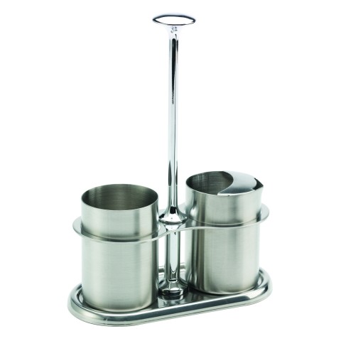 Creamer & Sugar Set, 5-3/4" x 2-3/4" x 7-1/2" holder, includes (1) 4 oz. creamer (STCCR4) and (1) 4 oz. sugar holder (STCSG4), dishwasher safe, 18/8 stainless steel, brushed finish (Priced per each, packed 12 each per case)
