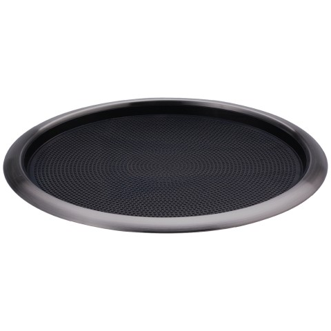 Tray, 16" dia. (14" inside), round, stackable, removable non-slip black rubber insert, dishwasher safe, 18/8 stainless steel, dark tungst (Priced per each, packed 12 each per case)