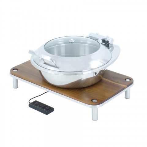 Domino Smart W Chafer Induction Set, large, includes: (1) SMART large round stainless steel chafing dish with glass lid (1A15301) (1) domino large tray stand (1A19406090) (1) rectangle induction wood platform with magnets (1A19406TDR) (1) induction warmer (1AIW110AC) 18/10 stainless steel, polished finish