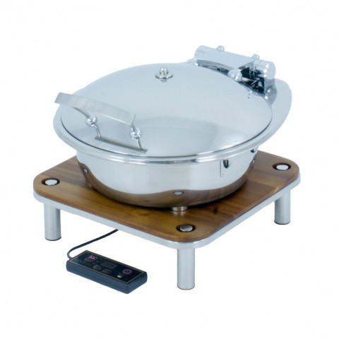 Domino Smart W Chafer Induction Set, medium, includes: (1) SMART medium round stainless steel chafing dish (1A15302) (1) domino medium tray stand (1A19405090) (1) square induction wood platform with magnets (1A19405TDS) (1) induction warmer (1AIW110AC) 18/10 stainless steel, polished finish