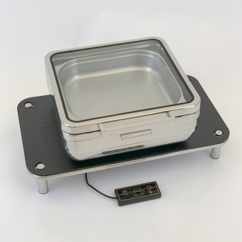 T-Collection Chafer Induction Set, includes: (1) T-Collection square stainless steel chafing dish with glass lid (1A15800CHO) (1) Domino large tray stand (1A19406090) (1) rectangle induction black phenolic platform with magnets (1ARECP) (1) induction warmer (1AIW110AC) 18/10 stainless steel, polished finish