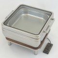 T-Collection Chafer Induction Set, includes: (1) T-Collection square stainless steel chafing dish with glass lid (1A15800CHO) (1) Domino medium tray stand (1A19405090) (1) square induction wood platform with magnets (1A19405TDS) (1) induction warmer (1AIW110AC) 18/10 stainless steel, polished finish