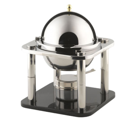 Domino Mini Sauce Chafing Dish, 1 qt. (1.05 liter), 10" dia. x 12-1/2"H, round, lid can open to 90° or lift up, rust & corrosion resistant, includes: mini porcelain food pan, fuel cup holder, removable versatile legs, 18/10 stainless steel, polished finish