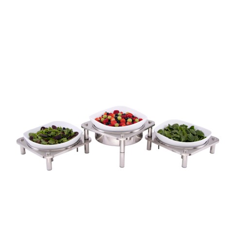 Cold Display Set, 14" x 14", includes: (3) domino medium tray stand (1A19405090) (3) medium round 18/10 stainless steel water pans (3) ice packs (1A11511) (3) medium 4 qt. white aluminum dish/bowl (1ASBW19405) (1) set of extra stainless steel legs (set of 2) (1A194022602)