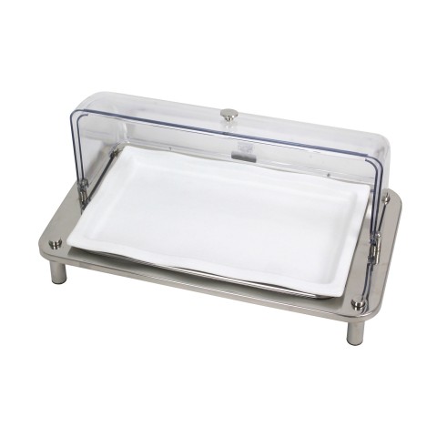Domino Cold Display, 26” x 16” x 14”, oblong, opens to 90°, rust & corrosion resistant, includes: stand, NSF coated aluminum tray, 2 ice packs, acrylic domed cover, 18/10 stainless steel, polished finish