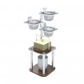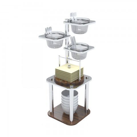 Domino Napkin Holder Service Stand Set, 10”L x 10”W x 24-3/4”H, includes: small 7" dish stand, stainless steel napkin holder with wooden bottom, 2-in-1 utensil condiment pole with (3) porcelain bowls & lids, 18/10 stainless steel, wood (spoons not included) (shipped in multiple boxes)