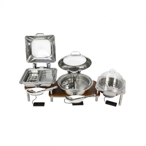 Domino Double Chafer and Biscuit Warmer Set, includes: (1) SMART W square stainless steel chafer with glass lid (1A15700) (1) SMART W large round stainless steel chafing dish with glass lid (1A15701) (1) Domino large tray stand (1A19406090) (2) Domino medium dish stands (1A19405090) (1) oblong wood induction platform (1A19406TDR) (1) square wood induction platform (1A19405TDS) (2) SMART induction warmers (1AIW110AC) (1) Smart induction warmer with magnets (1AIW110AC4) (1) medium cladded water pan (1A11402CLD) (2) G/N 1/3 size food pans (1A11103) (1) stainless steel 1/3 size drip tray (1A11516) (1) set of 2 1/2 size food pans (1A11221HLF) (1) stainless steel 1/2 round drip tray (1A11517) (1) stainless steel round drip tray (1A11521) (2) Smart W spoon holder sets (1A11272) (1) acrylic turn & serve dome cover (1A194BW8DOME) (1) stainless steel legs - set of 4 (1A19402260) (1) single stainless steel leg (1A19402261) 18/10 stainless steel, polished finish (ships in multiple boxes)
