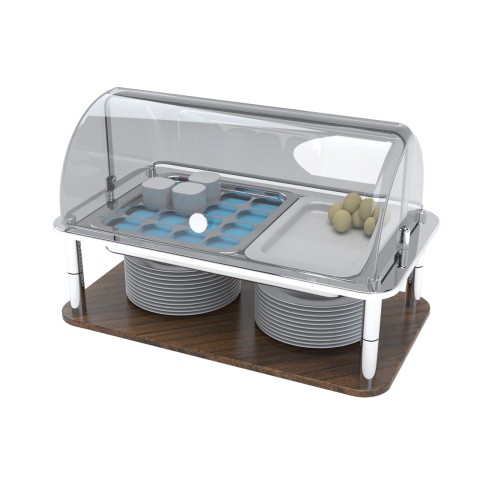 Domino Cold Display Chiller Set, includes: (2) ice packs (1A11511) (1) 1/2 NSF coated aluminum display tray (1ASBW11207250) (1) large 7" tray stand (1A19406180) (1) acrylic dome cover (1A19927BOM) (1) pan (1A11513STS) (1) 1/2 size stainless steel yogurt lid (1A11512HLF), (4) extra legs (1A19402260) 18/10 stainless steel, polished finish (shipped in multiple boxes)