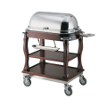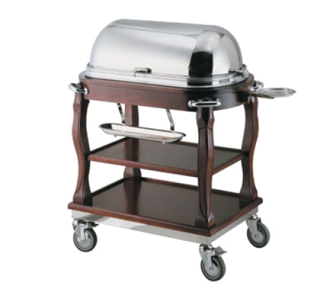 Roast Beef Trolley, 45"L x 23-3/4"D x 42-1/2"H, 18/10 stainless steel dome cover, Queen Anne style legs, 2 shelves, 5" casters, laminate film, natural wood plywood