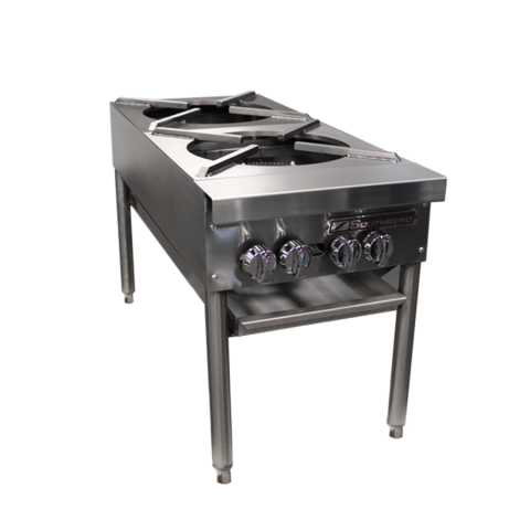 Stock Pot Range, 18", (2) cast iron burners, double, manual controls, one-piece tray, stainless steel front, front rail & sides, legs with adjustable feet, 90,000 BTU, CSA, NSF