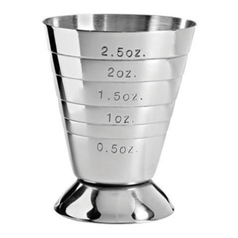 Multi-Level Jigger, 1/2 oz. x 2-1/2 oz. capacity, with external markings, footed base, polished stainless steel