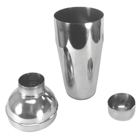 Cocktail Shaker Set, 3-piece, 24 oz., 3-5/16" dia. x 9-3/8"H overall, includes: (1) shaker, (1) strainer, and (1) jigger, stainless steel