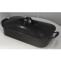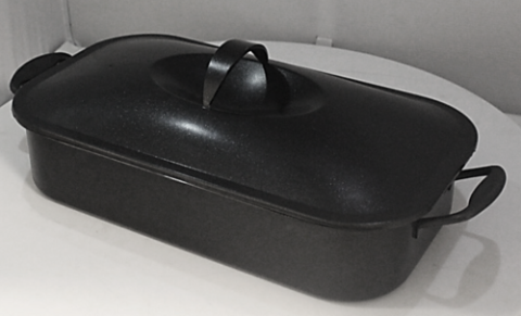 Homestyle induction server with insert, 5.4"H x 19.9"W x 9.4"D, black finish, 4 quart, rectangular, homestyle design, stainless steel construction with coated finish, versatile for induction, electric, gas, and fuel, oven-safe, welded handles without rivets, easy-to-read water fill line, removable and dishwasher safe stainless steel insert, black finish homestyle induction server with insert