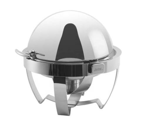 Rondo Chafer, round, 3 to 8 qt., 13-3/4" dia. x 18-2/5"H, 13-3/4" full size insert, roll top lid, support ring, fuel holder & resistance axle system, cord routing system in frame for heating element cord, chrome plated handle & axle covers, 18/10 stainless steel, mirror polished finish, NSF (Stock Item)