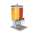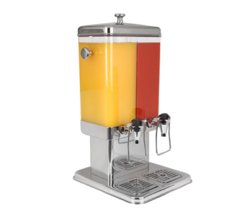 Beverage/Juice Dispenser, double, (2) 5 liter polycarbonate vessels, 12" x 14" x 26" (overall dimensions), central ice tube with water drain, one handed dispensing, drain tray, 18/10 stainless steel lid and base, NSF (Stock Item)
