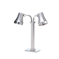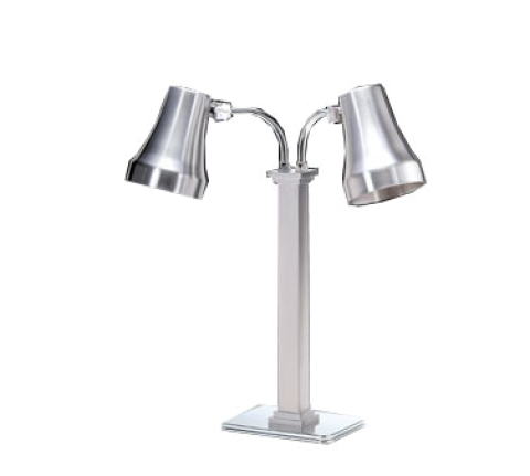 Double Heat Lamp, 8"W x 10-1/2"D base, 15-7/10" overall depth (base to front of shade), 25-3/5" overall height, solid arms, 18/10 stainless steel with brushed finish, includes: (2) 250 watt bulbs, 220-240v/50/60/1-ph, 2.1 amps, (international version, specify plug) (Stock Item)
