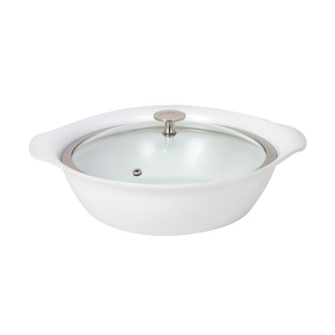 Motif Casserole Pan, 3-3/4 qt., 12" dia. x 3-1/4" deep, round, with tempered glass cover, Teflon® non-stick and QuanTanium® interior, coated stainless steel induction base, two-ply exterior, constructed of cast aluminum with ceramic reinforced finish, white (Stock Item)