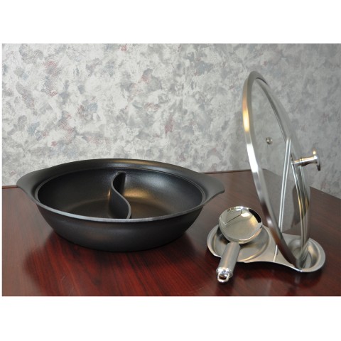 Motif Casserole Pan, 3-3/4 qt., 12" dia. x 3-1/4" deep, divided, round, with tempered glass cover, Teflon® non-stick and QuanTanium® interior, coated stainless steel induction base, two-ply exterior, constructed of cast aluminum with ceramic reinforced finish, titanium (Stock Item)