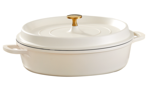 Ironlite Shallow Casserole, 4.4 qt. (5 liter), 11" dia. x 4-3/4"H, deep, with lid & handles, 500° F (260° C) max temperature, white, cast-iron aluminum and ceramic material, 1-year warranty