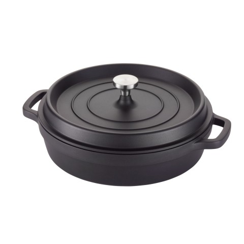 Ironlite Casserole, 2.7 qt. (2.6 liter), 11" dia. x 2-3/8"H, round, shallow, with lid & handles, non-stick interior, self-braising cover, for gas, electric, and induction cooking, dishwasher safe, aluminum, black exterior, black interior (Stock Item)