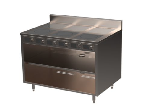 BOH Induction Flameless Cooking Cart, electric, 48", (6) 2,600 watt burners, manual controls, 304 stainless steel welded construction, open cabinet base, (1) fixed shelf, adjustable feet, 208-240v/60/1-ph, 10.8 amps, UL, ETL, ETL Sanitation (Made in the USA of domestic and imported parts)