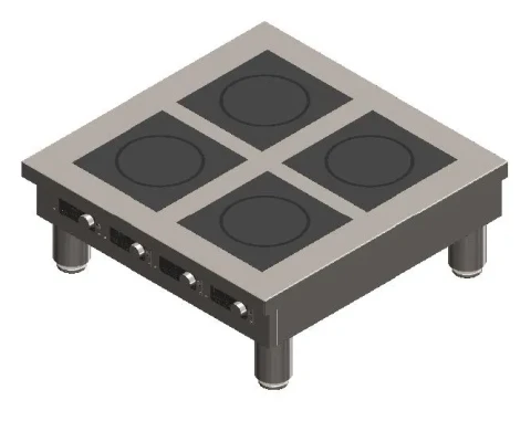 BOH Series Flameless Induction Cooktop, countertop, 4-zone, 36”W and 14”H with 4” stainless steel leveling legs, stainless steel construction, power level 1-20 (cook mode), easy-access control panels, Cook’/’Temp’ mode touch pad control, tempered glass top and 14-gage stainless steel top, 3500W, FCC, ETL, ETL-Sanitation