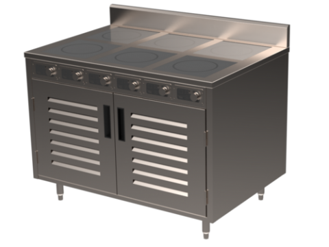 BOH Induction Flameless Cooking Cart, electric, 48", (6) 3,500 watt burners, manual controls, 304 stainless steel welded construction, enclosed cabinet base with doors, (1) fixed shelf, adjustable feet, 208-240v/60/1-ph, 16 amps, UL, ETL, ETL Sanitation (Made in the USA of domestic and imported parts)
