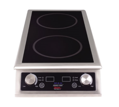 MAX Induction™ Cook & Hold Range with Griddle Attachment, countertop/built-in, double, 28"W x 18-1/8"D x 4-5/8"H, low profile design, SmartScan® technology with over/under voltage protection, pan size & pan type recognition, large LED power/temp display, tempered smoked black glass faceplate, 5mm tempered glass top, silicone rubber protective top seal, non-skid/non-scratch base & footing, removable mesh air filter, solid state controls, power on/off knob & power on/pan-present indicator lights, 2-function: cook or temp mode, knob-set thermostat control, lighted temperature indicator, power level: 1-20 in "cook" mode, temperature range: 110° - 400° F (43° - 204° C) in "temp" mode, satin stainless steel body, 208-240v/60/1-ph, (2) 2500 watt burners, (2) 10.4 amps, NEMA 6-30P, ETL, UL-STD 197, FCC, cETL, ETL-Sanitation to NSF-4, ENERGY STAR® (Stock Item)